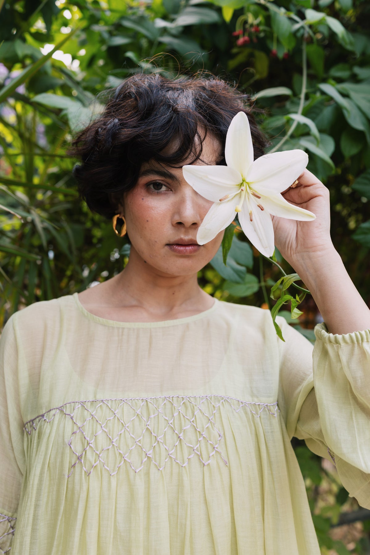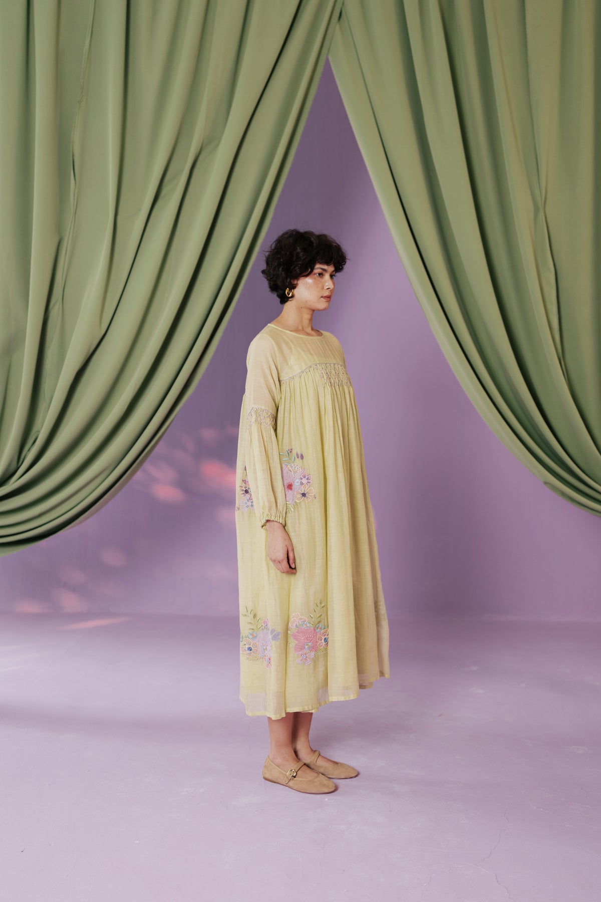 Magnolia 26 features intricate multicolored thread embroidery on cotton silk. The green base gives it freshness, while the craftsmanship keeps it timeless.