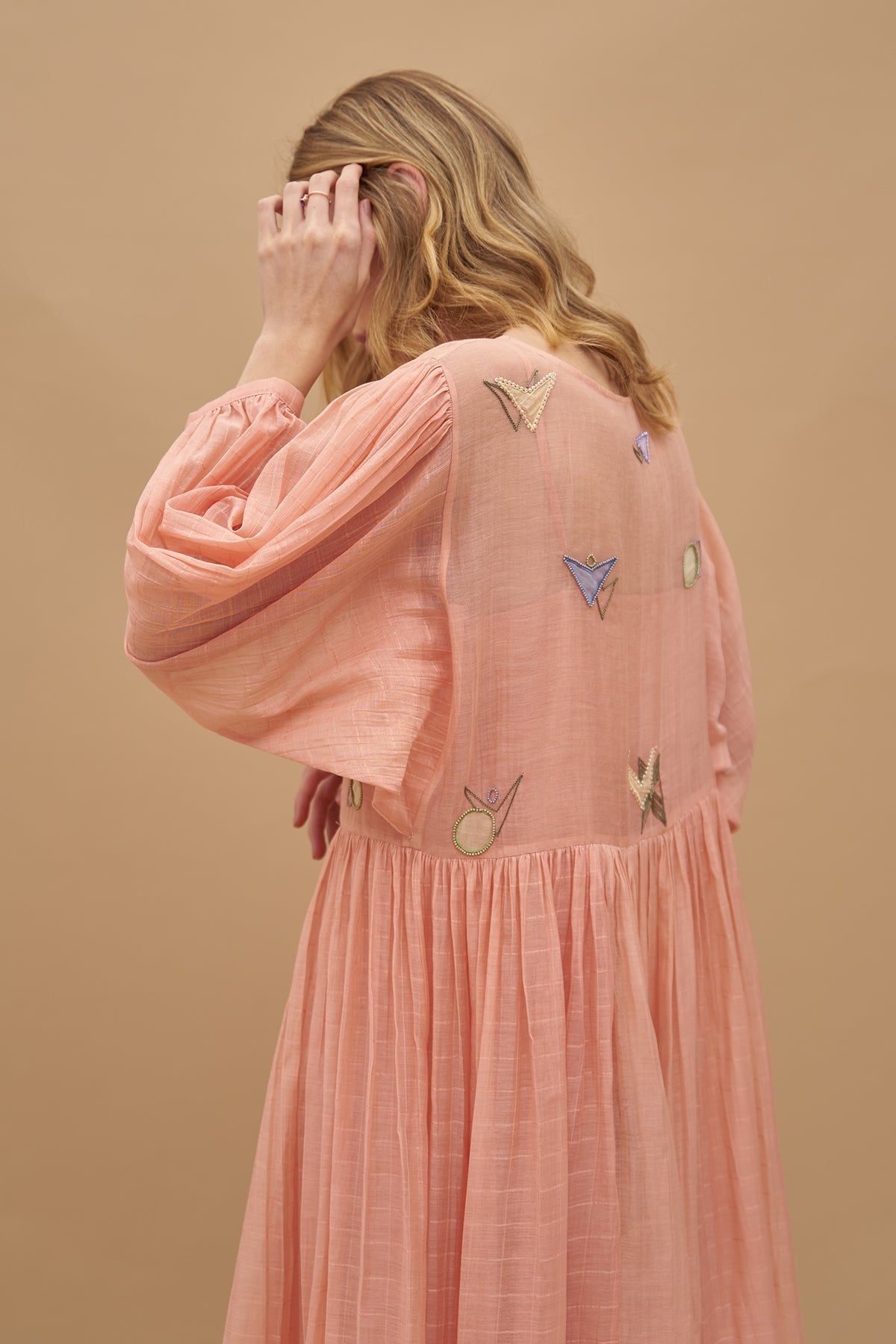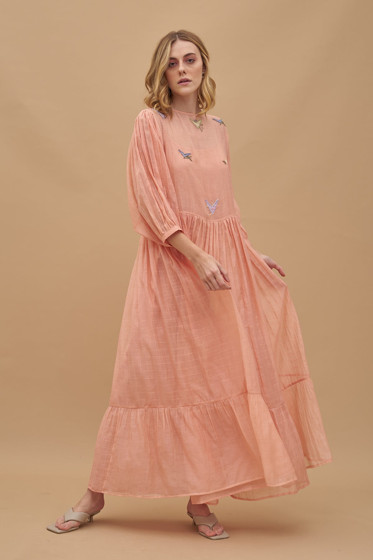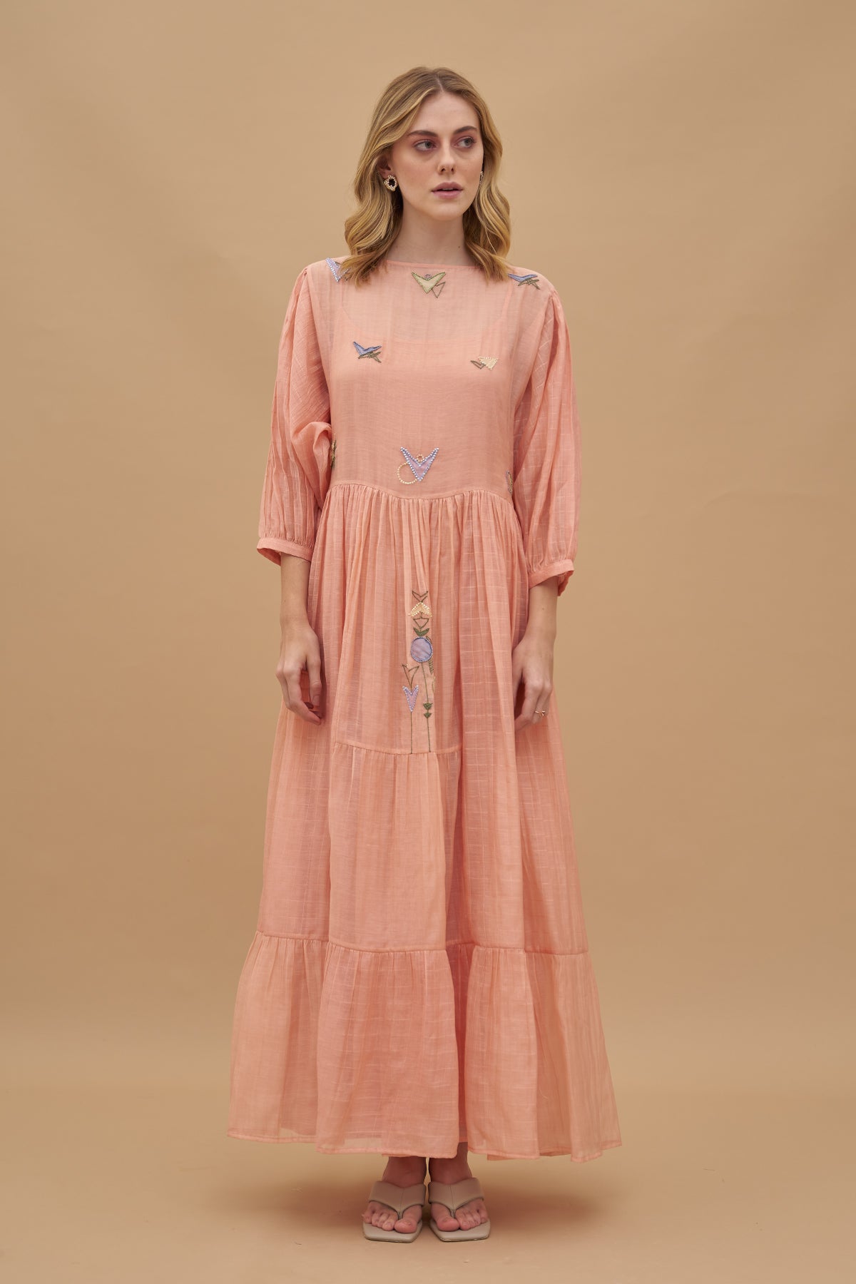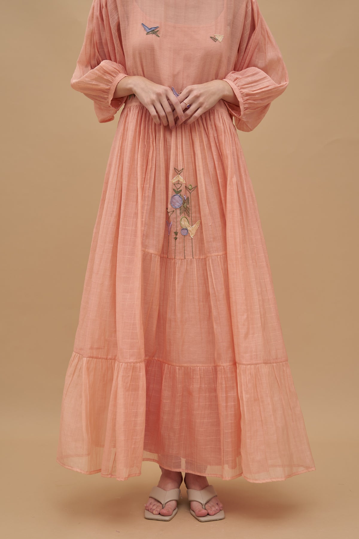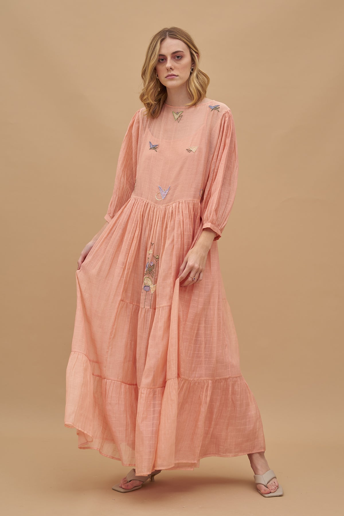 A floating Maxi dress, rendered in a light peach-orange tone. Geometric threadwork & applique in multiple Colors adorn its checked cotton silk fabric base. It has cuffed balloon sleeves and comes with a separate slip.