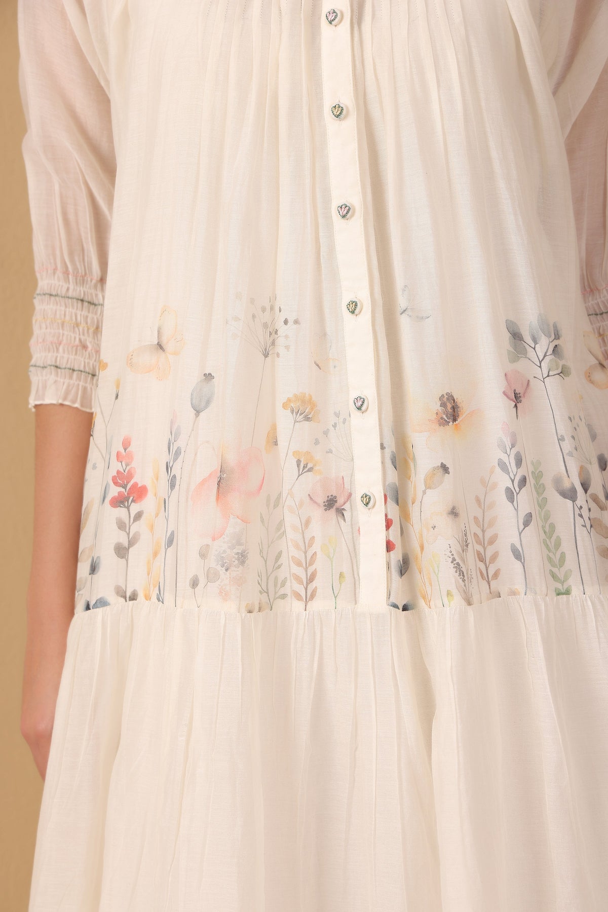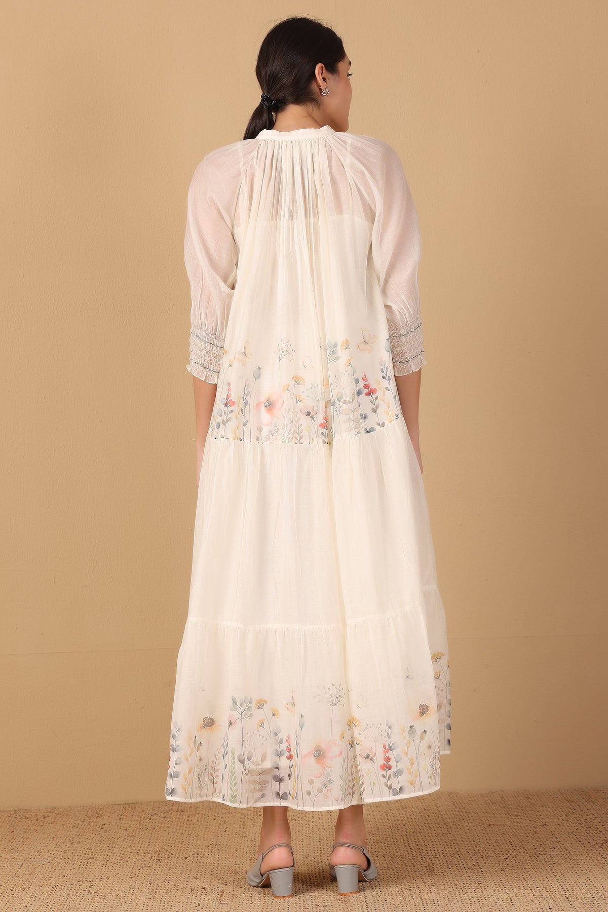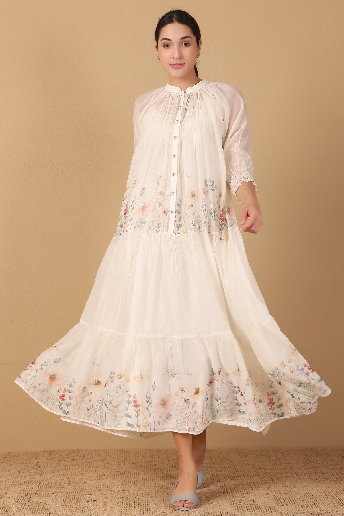 Lulu dress features the captivating Flowers in a Row print on luxurious cotton silk. This charming piece is perfect for adding a touch of nature to your style.