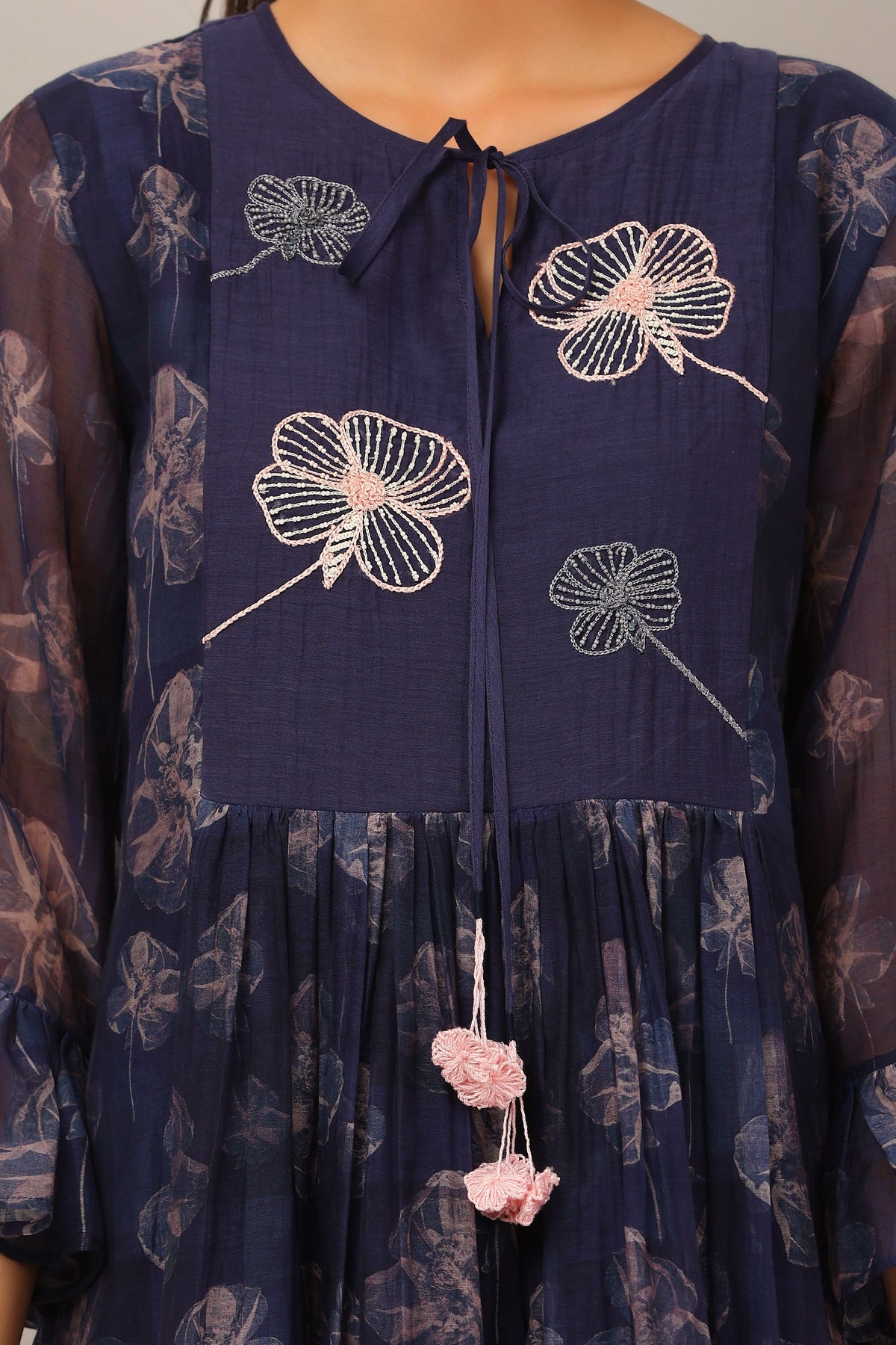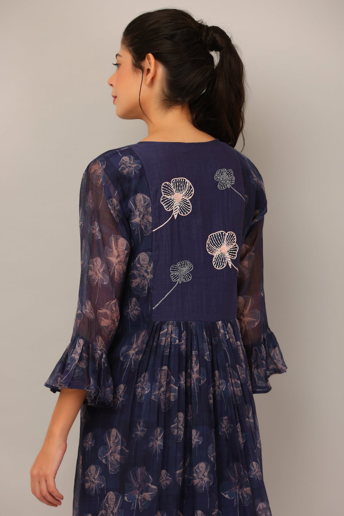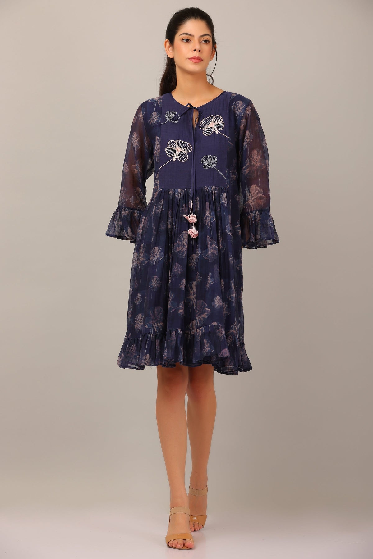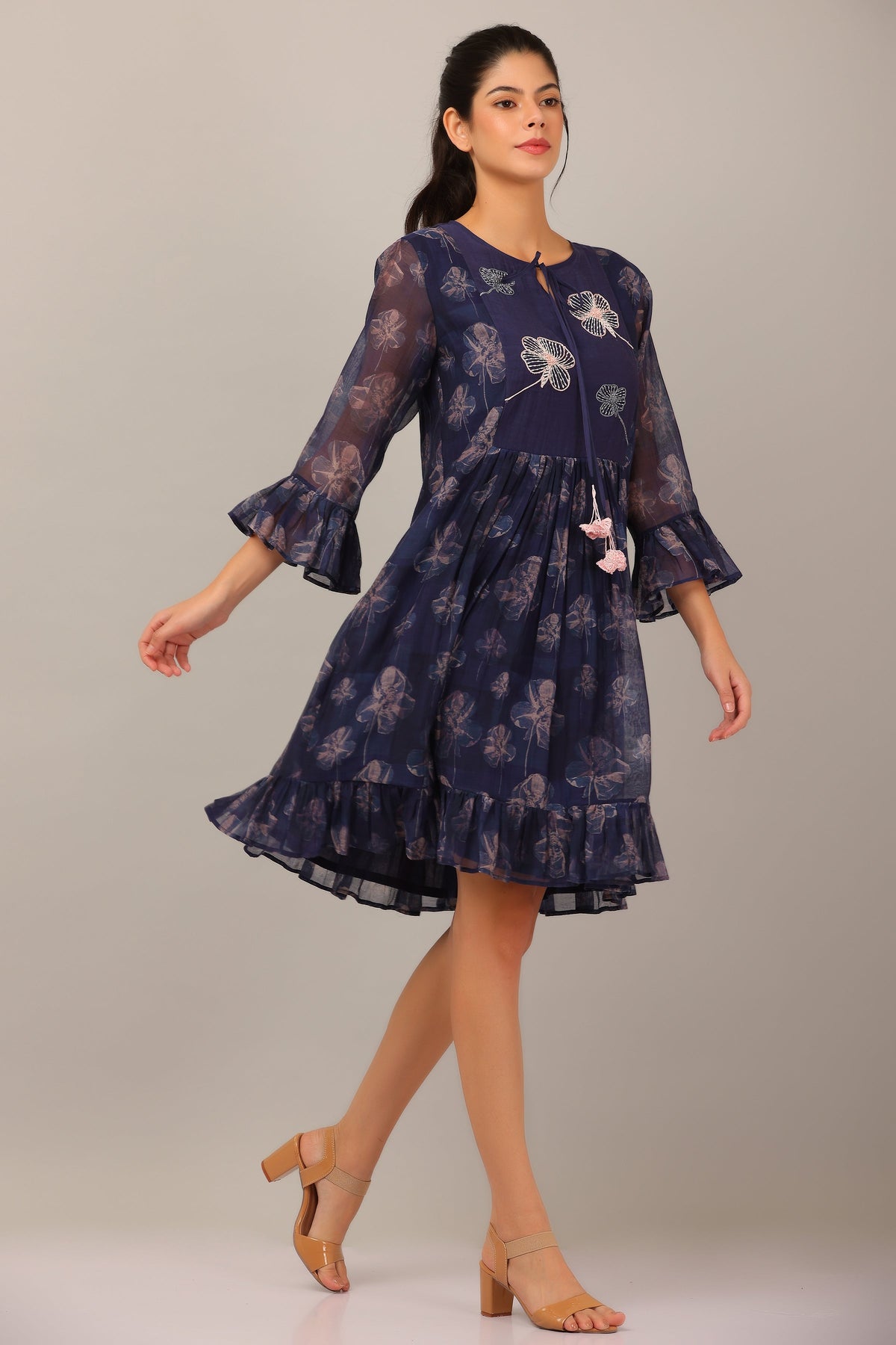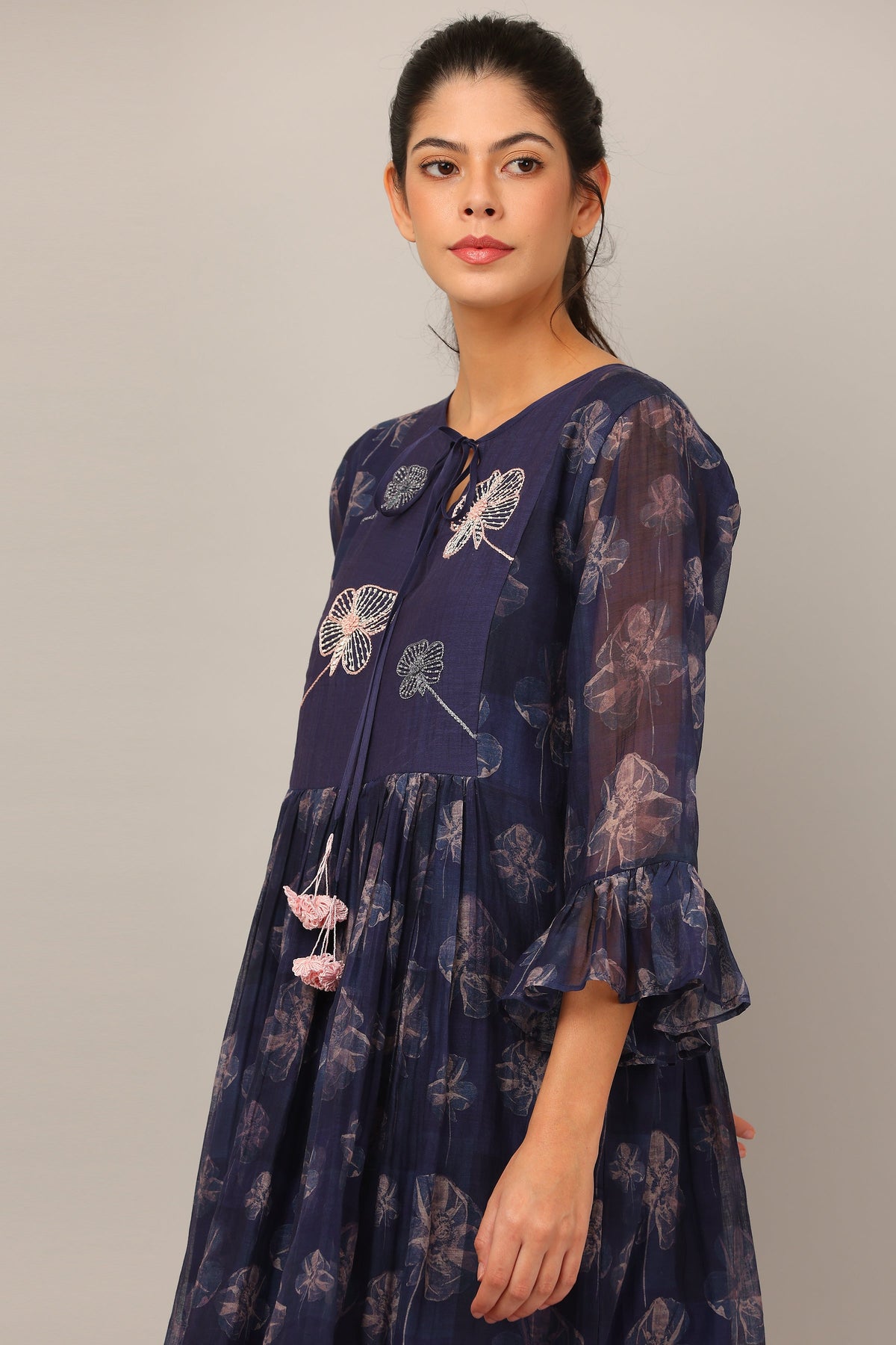 Inspired by flora at midnight, this cotton silk dress features a dancing flower print, tie detail neckline and beautiful ruffles sleeves.