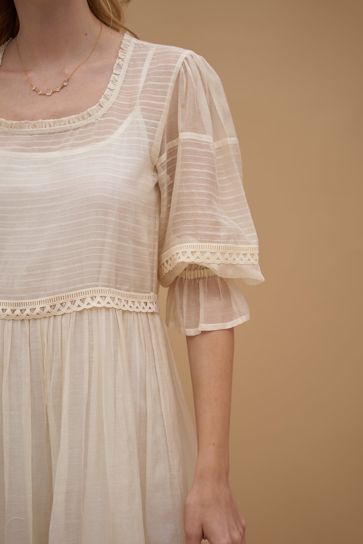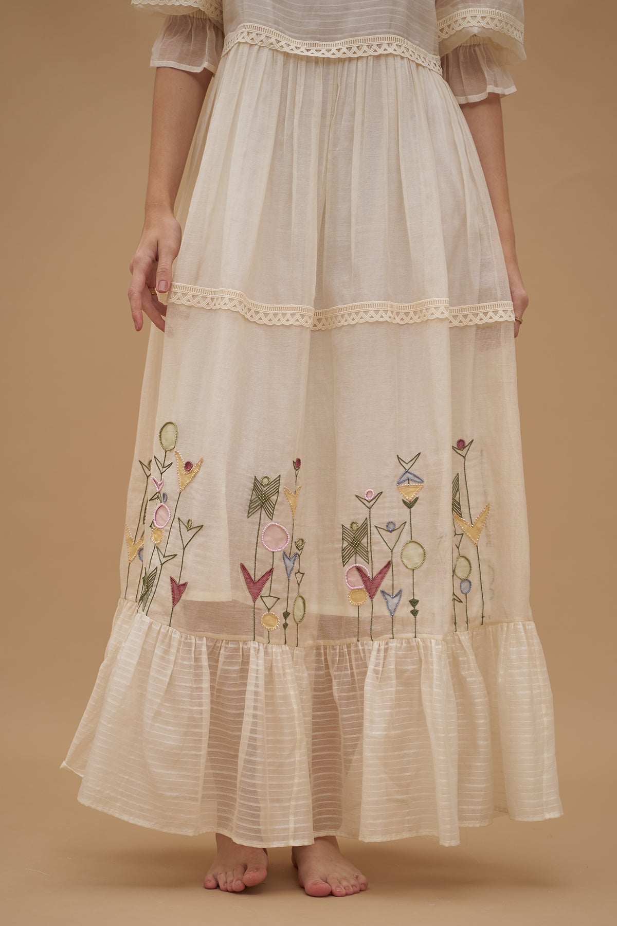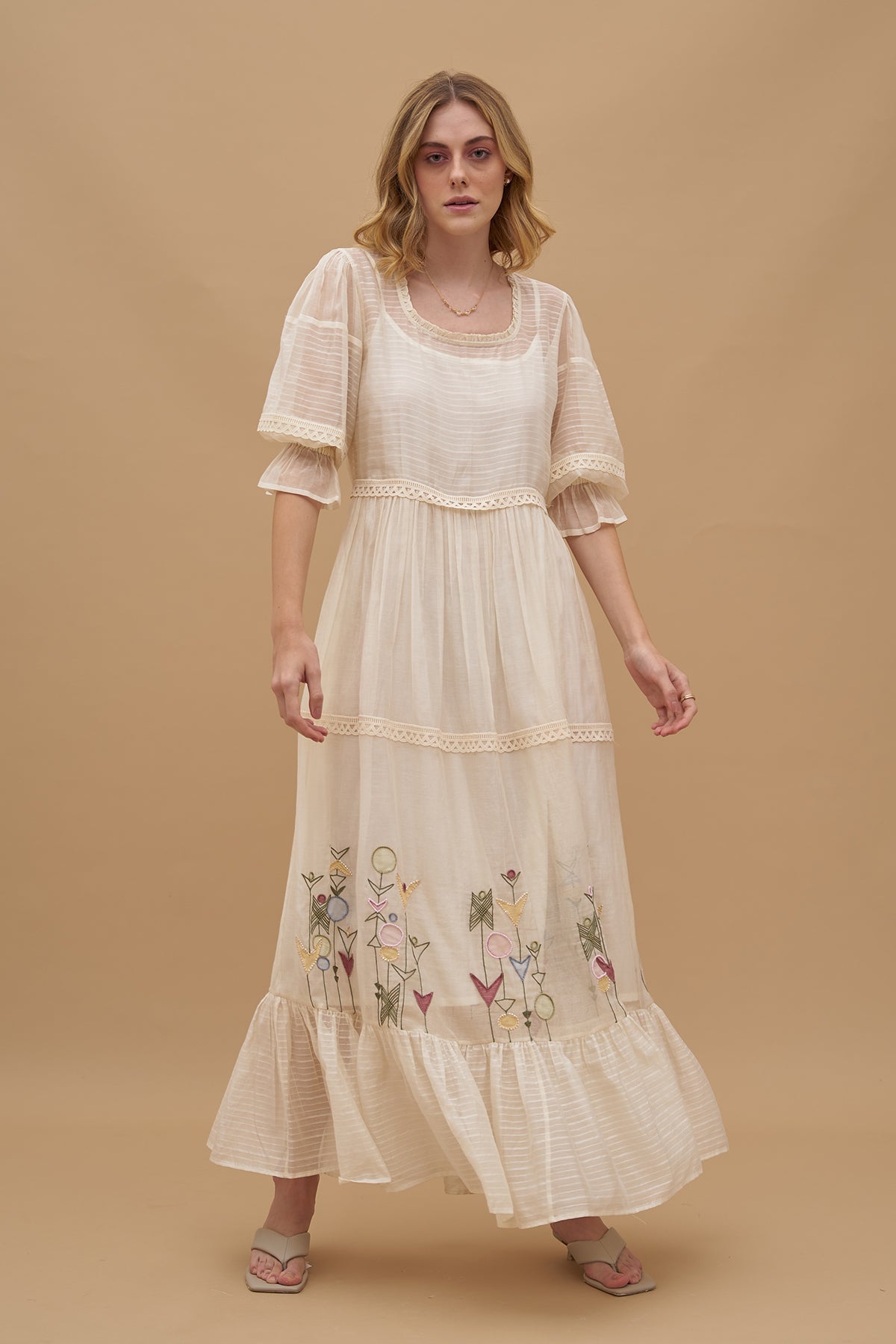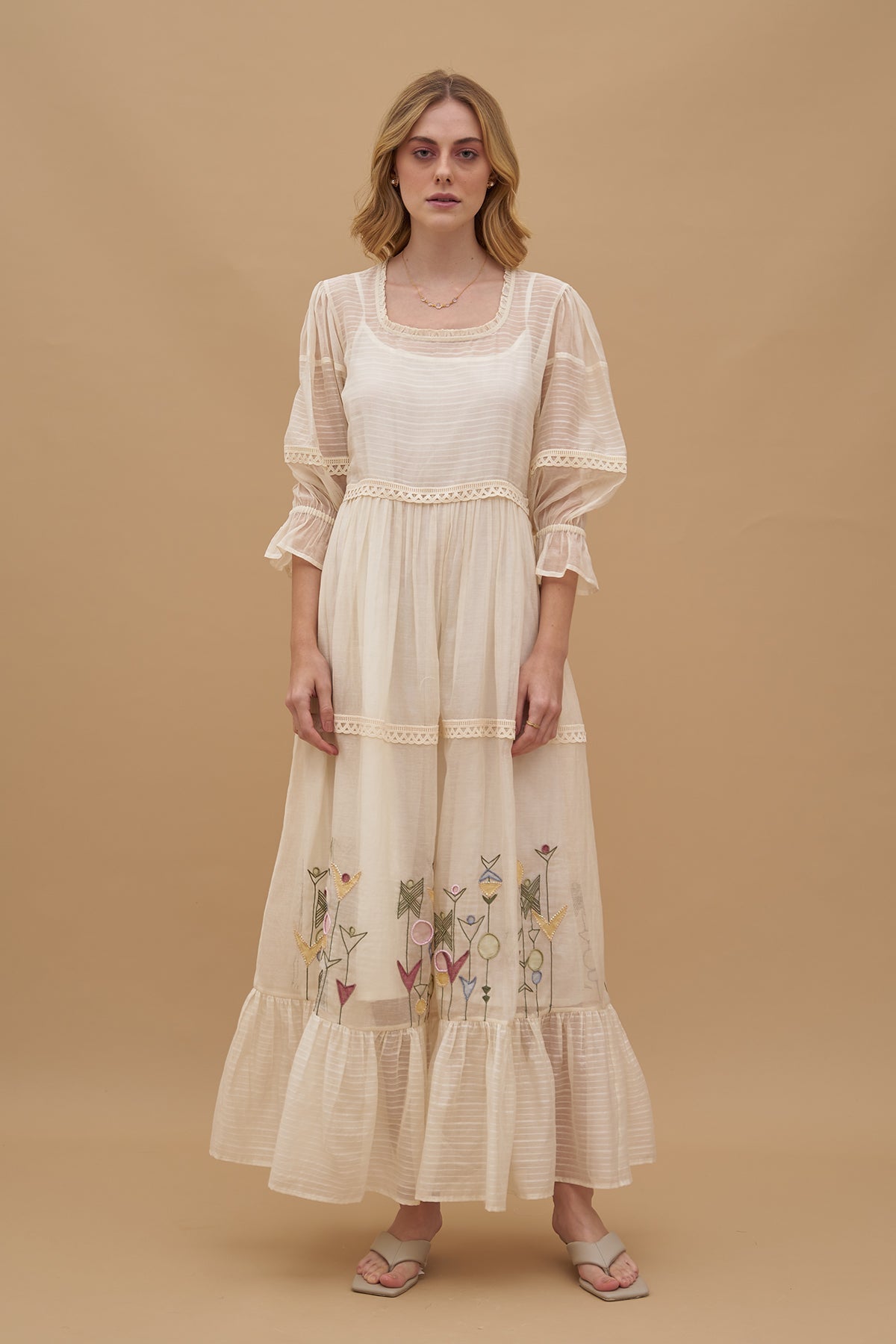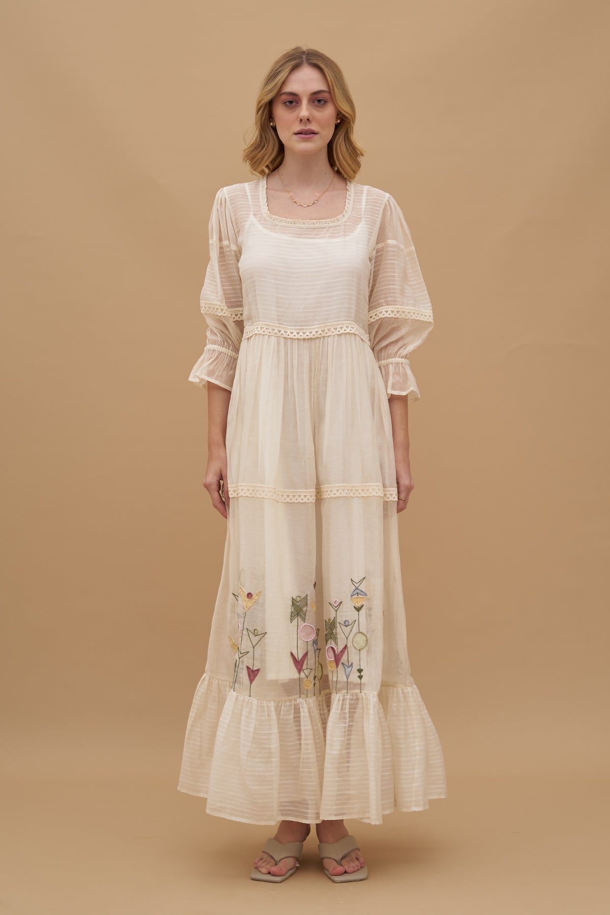 A see-through dreamy Ivory Maxi Dress, enhanced with gathered flounce at the hemline, decorated puff sleeves, a curved square neckline, multiColored embellishments in the skirt & scalloped lace trimmings.